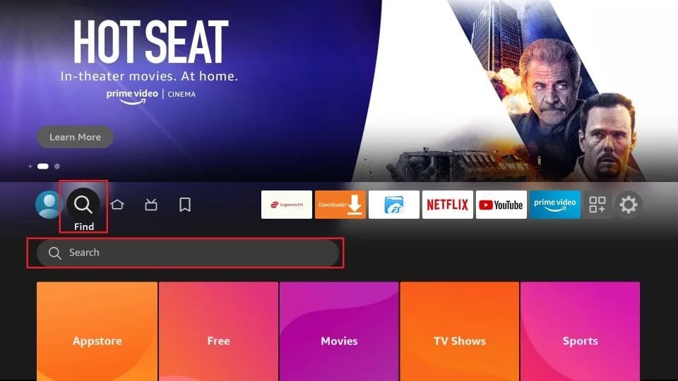 Lépj a Fire TV / Stick kezdőképernyőjére. A távirányítóval navigálj a "Find" > "Search" menüpontra a képernyő közepén található menüsorban.