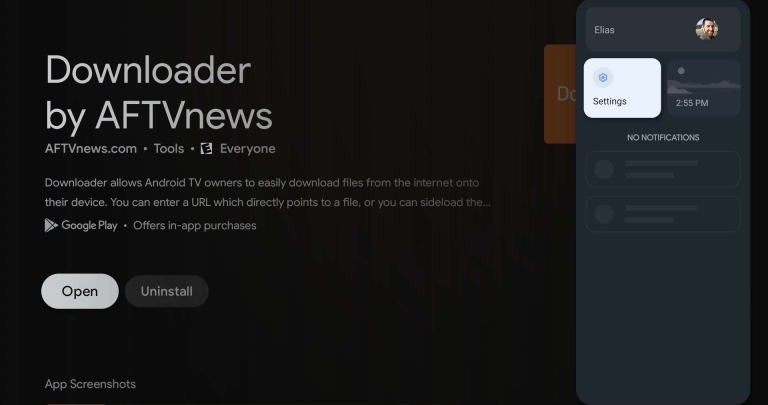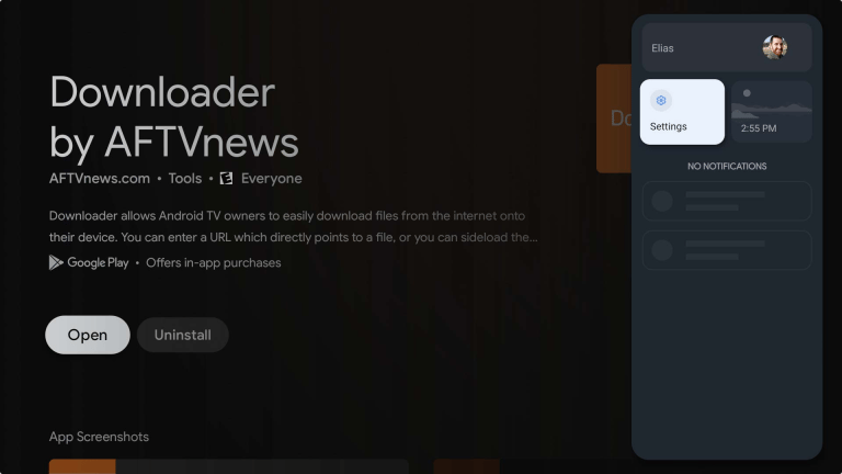 Az alkalmazás telepítése után még ne indítsd el. Először engedélyezni kell a fejlesztői módot, hogy engedélyeztesd a Downloader számára, hogy ismeretlen forrásból telepítsen alkalmazásokat. Ehhez lépj az eszköz Beállítások képernyőjére. Ezt úgy érheted el, hogy kiválasztod a körprofil ikonját a kezdőképernyő jobb felső sarkában, vagy a távirányító Kezdőlap gombjának lenyomásával és lenyomva tartásával ugyanaz a menü jelenik meg.