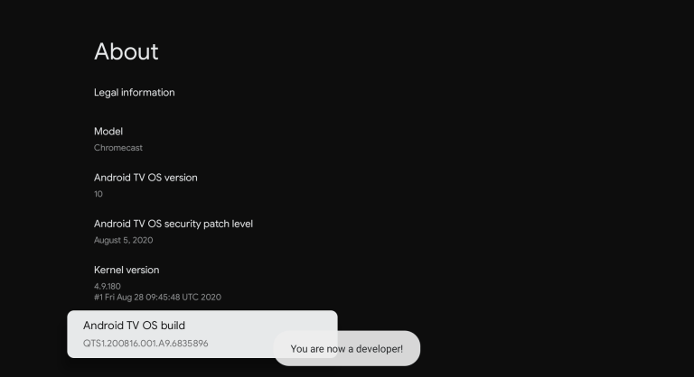 Görgess le az „Android TV OS Build” elemhez legalul, és válaszd ki (nyomd meg) újra és újra. Először semmi sem történik, amikor kiválasztod a menüpontot, de végül megjelenik egy üzenet az alján, amely szerint „Most [#] lépés választja el attól, hogy fejlesztő legyen.” Addig válassza az „Android TV OS Build” menüpontot, amíg meg nem jelenik az „Ön most fejlesztő!” a képernyő alján.