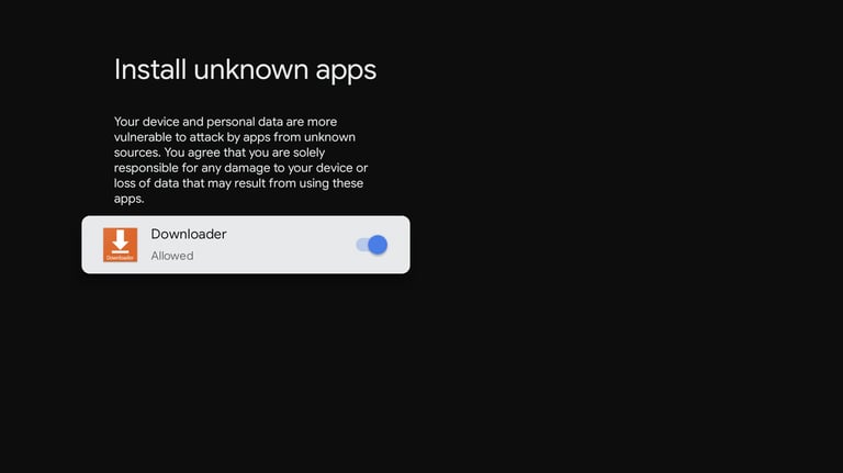 Most már engedélyezheti a Downloader alkalmazást, hogy ismeretlen forrásokból származó alkalmazásokat telepítsen. Ezt a Beállítások > Alkalmazások > Biztonság és korlátozások > Ismeretlen források menüpontban teheted meg. Innen válaszd a Downloader lehetőséget, hogy a beállításd „Engedélyezett” értékre.